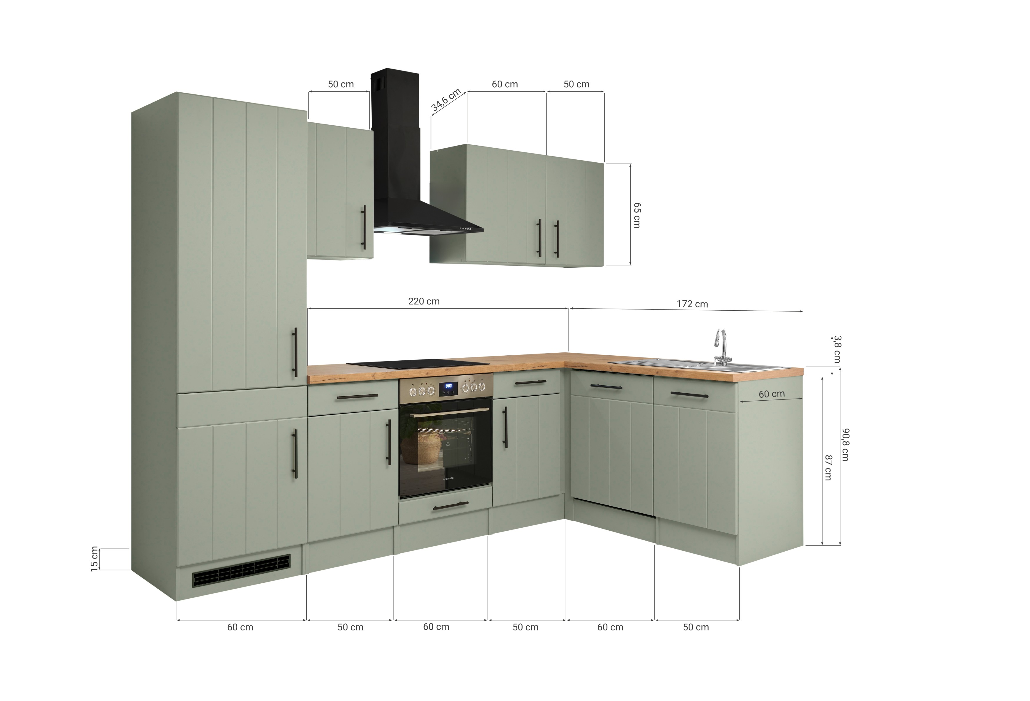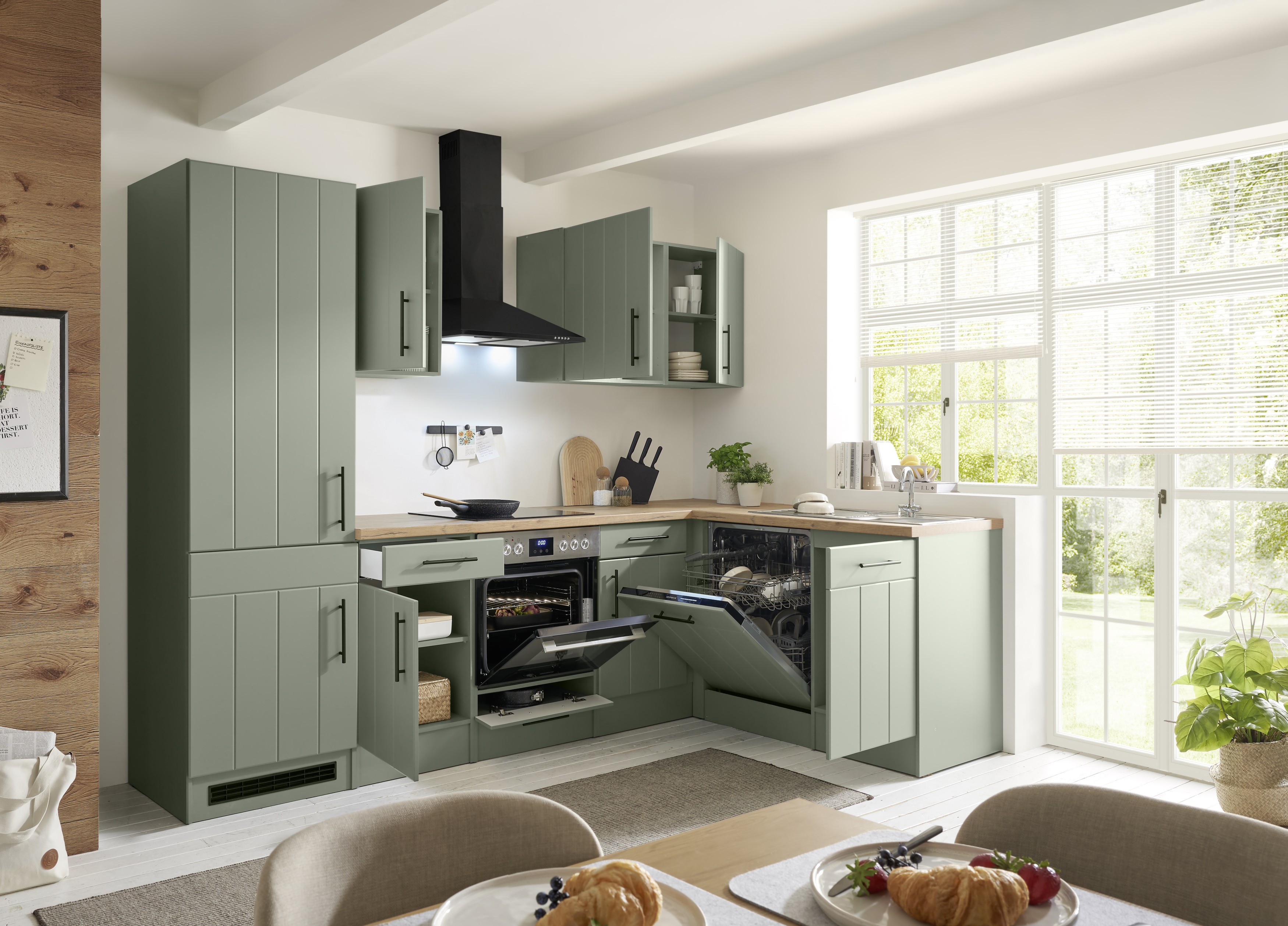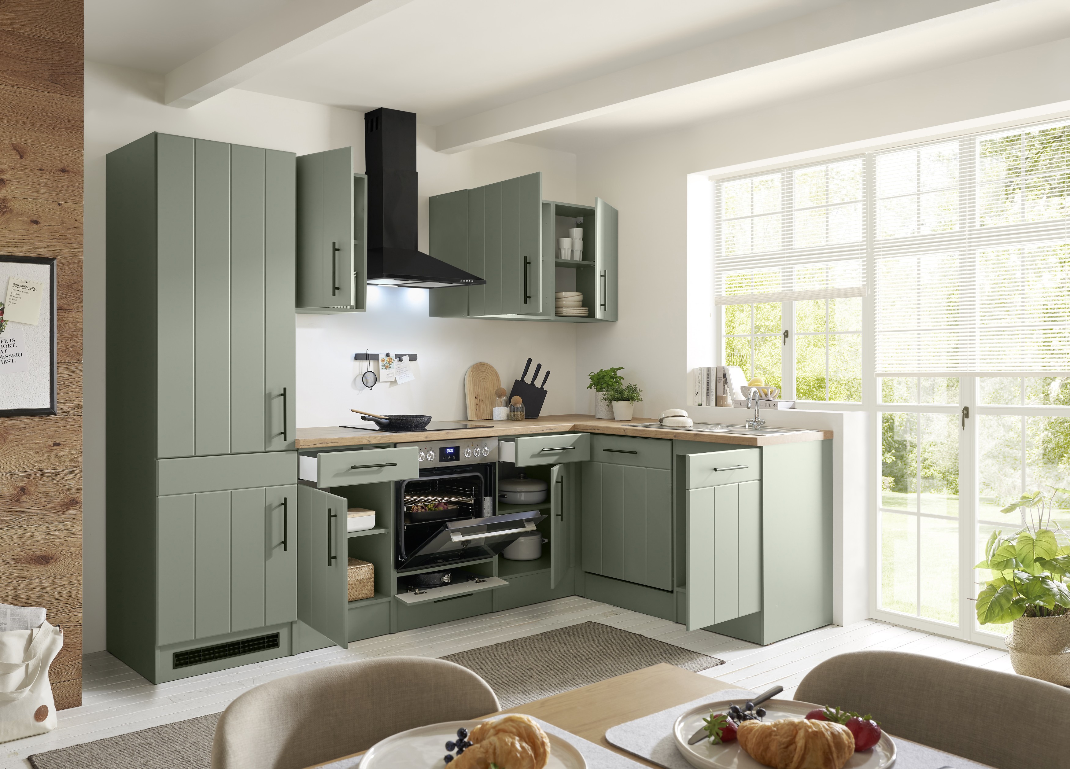 Die Premium Landhaus-Winkelküche Anton kombiniert zeitloses Landhausdesign mit moderner Ausstattung. Korpus und Fronten in mattem Schilfgrün treffen auf eine Arbeitsplatte in Wildeiche-Nachbildung, ergänzt durch elegante mattschwarze Metallgriffe – ein harmonischer Look mit warmen Naturakzenten.