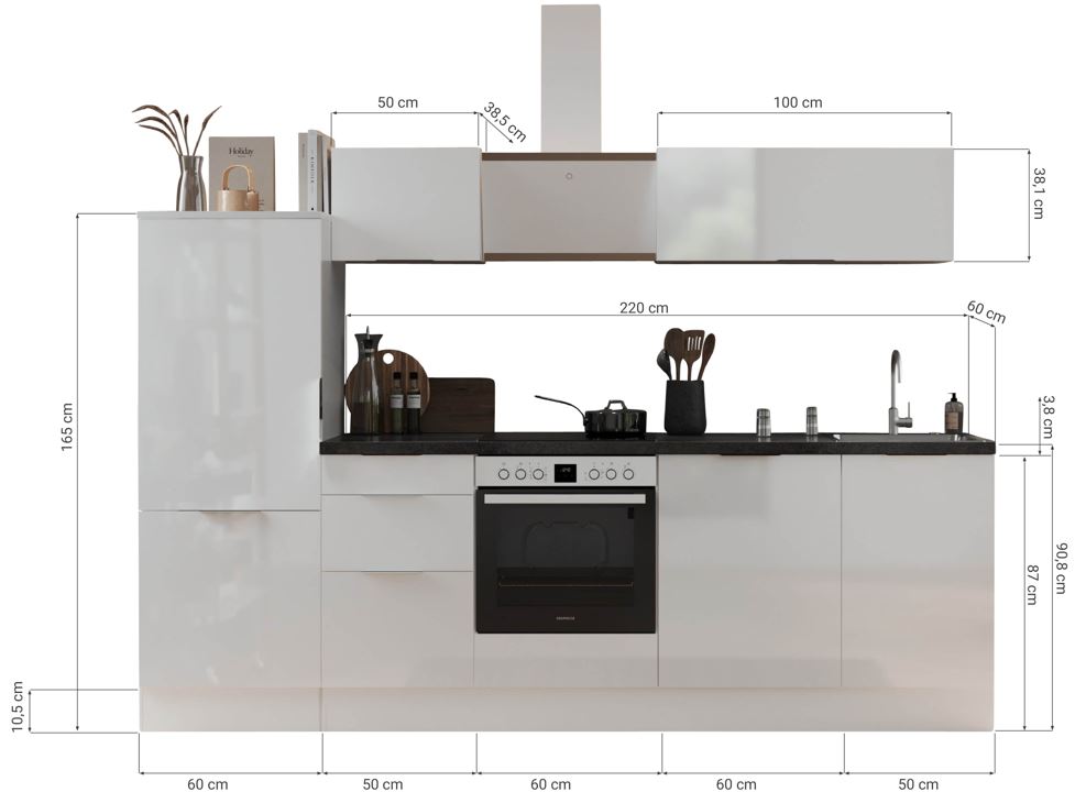 Mit der hochwertigen Küchenzeile "Elisabeth" der Marke Respekta Selection erhält Ihre Küche eine komplette Einrichtung. Sie ist vormontiert und dadurch besonders aufbau- und montagefreundlich. Die E-Geräte sind enthalten. Sie können die Küche in verschiedenen Farbkombinationen erhalten. Optisch punktet die Einbauküche durch ihr modernes Erscheinungsbild. Die Ausstattung ist hochwertig. Die Scharniere und Auszüge sind mit einschaltbarer Dämpfung, Schubkästen und Auszüge mit Vollauszug und 8 mm Glaseinlegeböden bei Hängeschränken sind nur einige davon. Die Küche ist "Made in Germany".